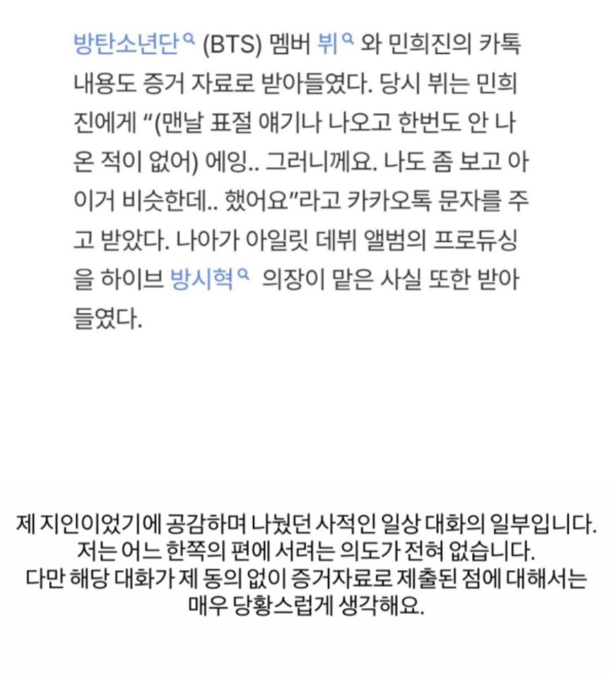 - 뷔는 “사적인 대화가 동의 없이 증거로 제출돼 매우 당황했다”며 입장을 밝힘