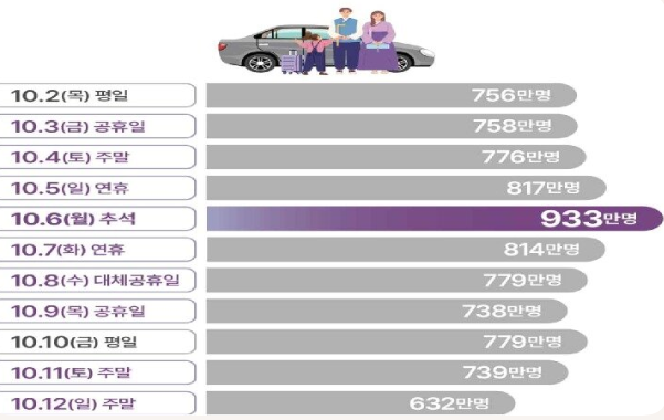 - 추석 당일(10월 6일)에는 933만 명이 이동하며 최대치를 기록했어요.